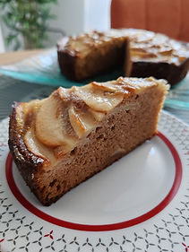 Pour finir, ajoutez la fleur de sel et la cannelle, mélangez à peine. Épluchez les 2 pommes restantes et coupez-les en fines tranches. Versez les cubes de pommes caramélisés dans la préparation, versez le tout dans votre moule préalablement beurré.