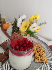 Au moment de servir, verser un peu de coulis de framboises sur chaque panna cotta, ajouter les fruits de Grenade par dessus.